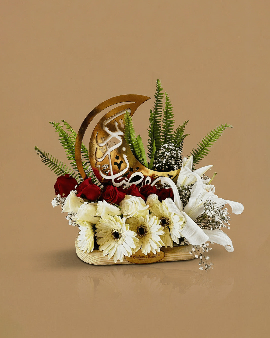A natural wooden base adorned with imported crafted golden crescent and Ramadan Kareem luxuriously decorated with natural white imported oriental lilies, natural imported red and white roses, natural imported white gerberas and lush greenery; a regal Ramadan treasure symbolizing light, purity and festive elegance.
