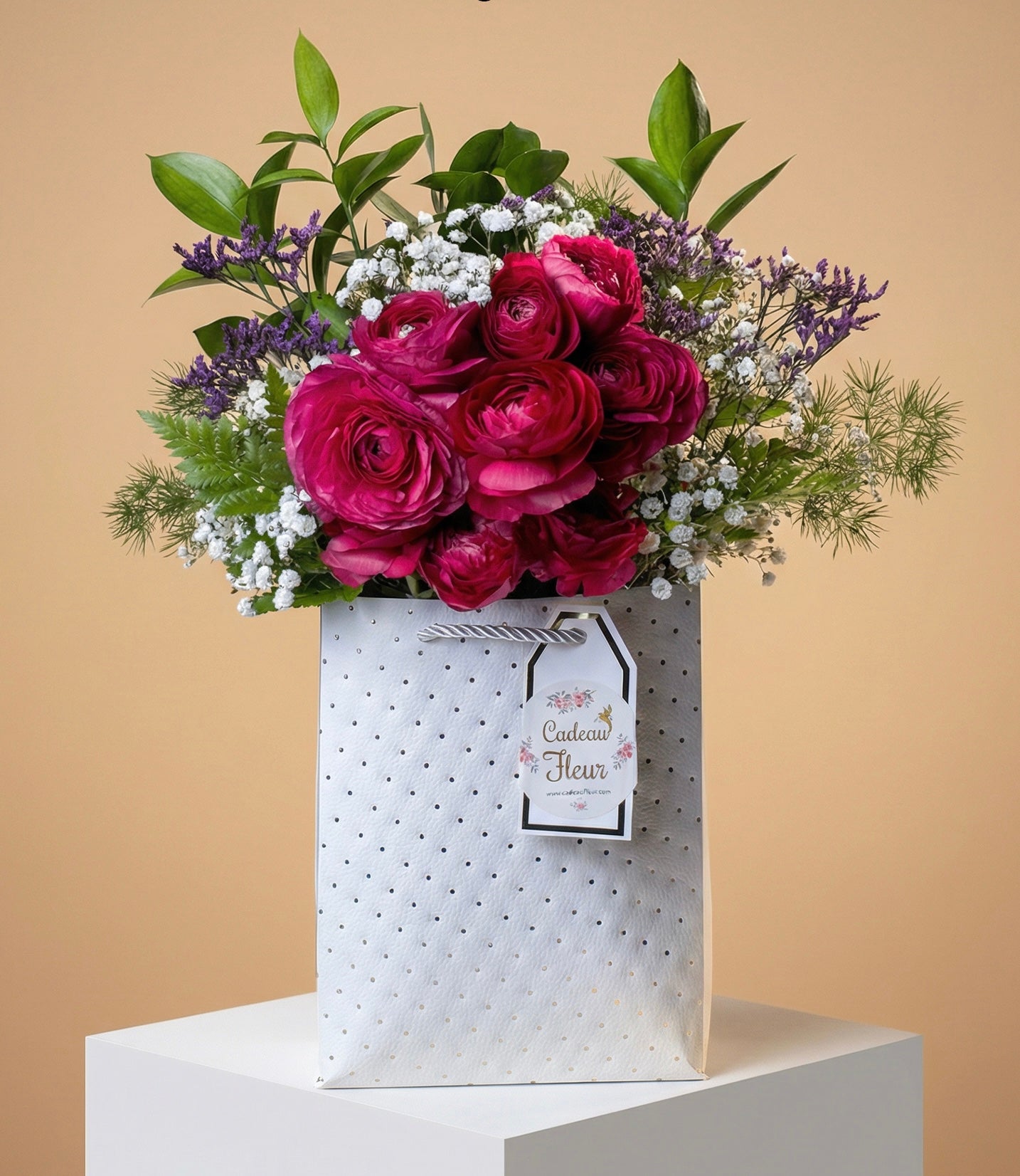Why settle for a bouquet when you can give a statement? Featuring deep velvety magenta imported ranunculus and frothy white filler, this arrangement is tucked inside a polka dot gift bag. It's the compact, portable and perfectly poised, it's a celebration in a bag