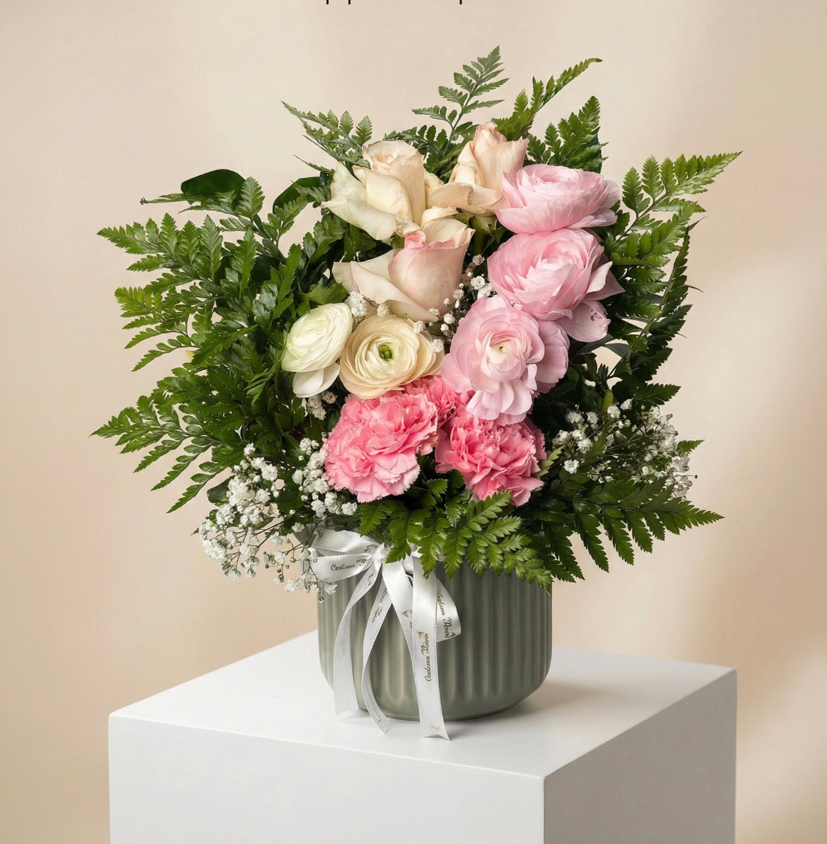 A masterclass in texture and tone. This arrangement balances the structured elegance of a sage green ribbed imported porcelain pot with the soft cloud like layers of natural imported carnations, ranunculus, and senioritas. Wrapped in a signature white ribbon, it is framed by abundance of leather leaves and delicate baby's breath creating a 360-degree garden experience for any room