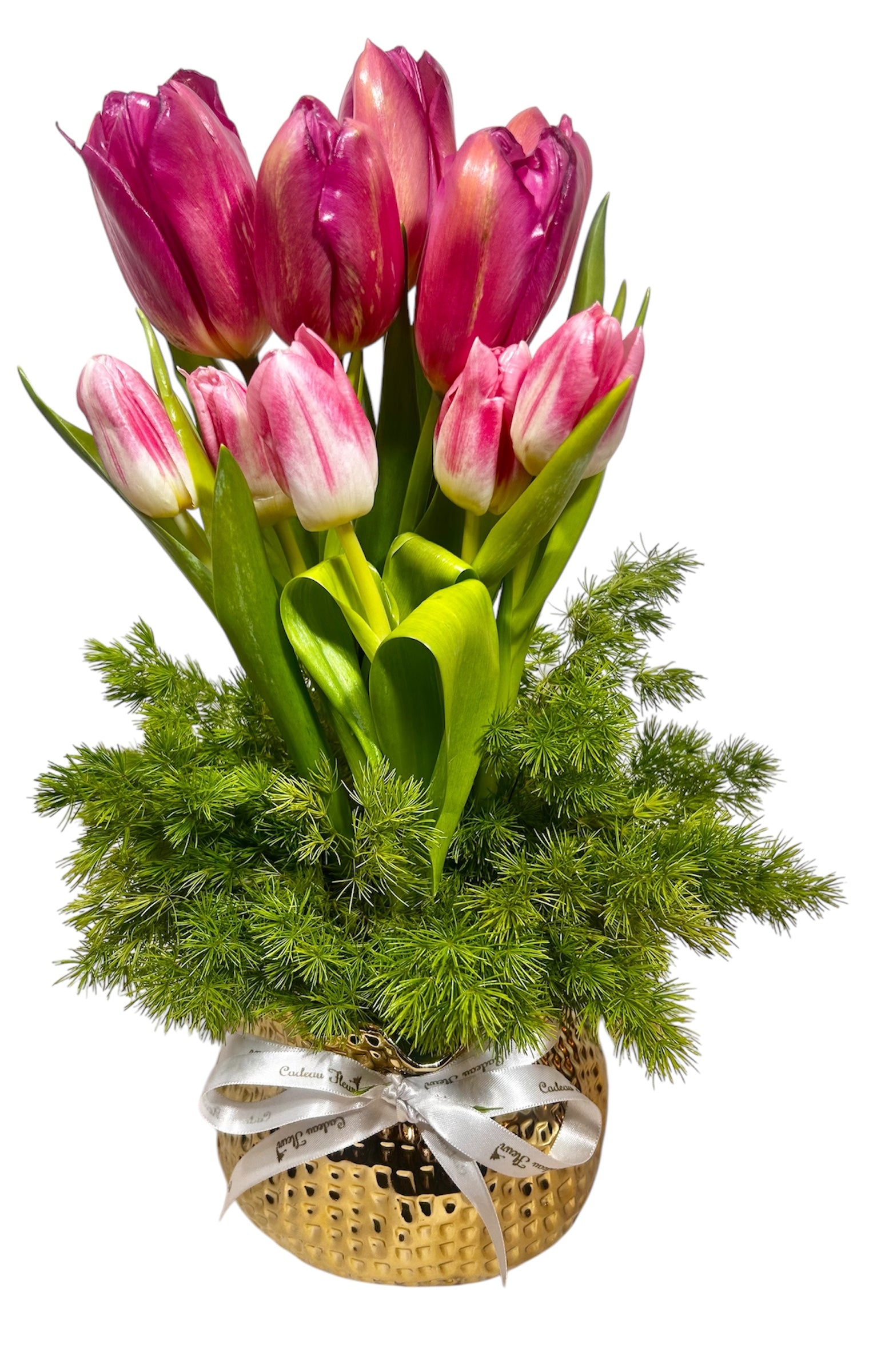 Exquisite arrangement of a timeless gift radiating warmth and sophistication. Luxurious golden imported reusable porcelain pot overflowing with natural fresh imported pink and fuchsia tulips. the design captures warmth and grace of spring in a stylish and timeless display