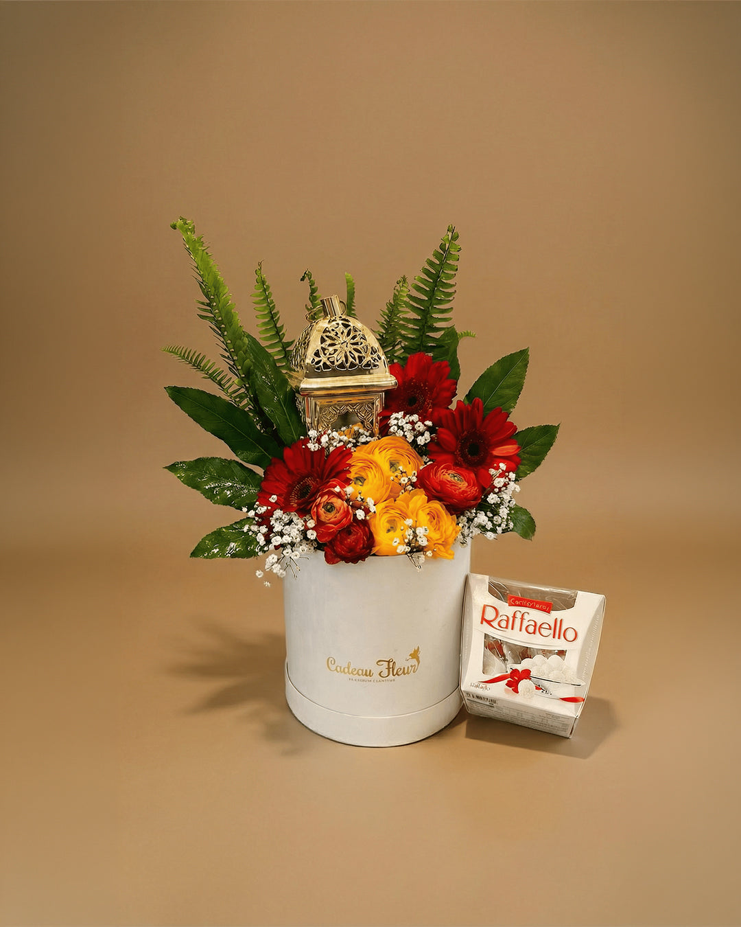 A white cylinder box with beautifully crafted imported golden lantern lights and sings adds a traditional Ramadan glow, while red imported gerberas and yellow imported ranunculus represent a meaningful gift that expresses heartful gratitude , joy of gathering , and renewed faith and blessings that Ramadan brings into our homes.